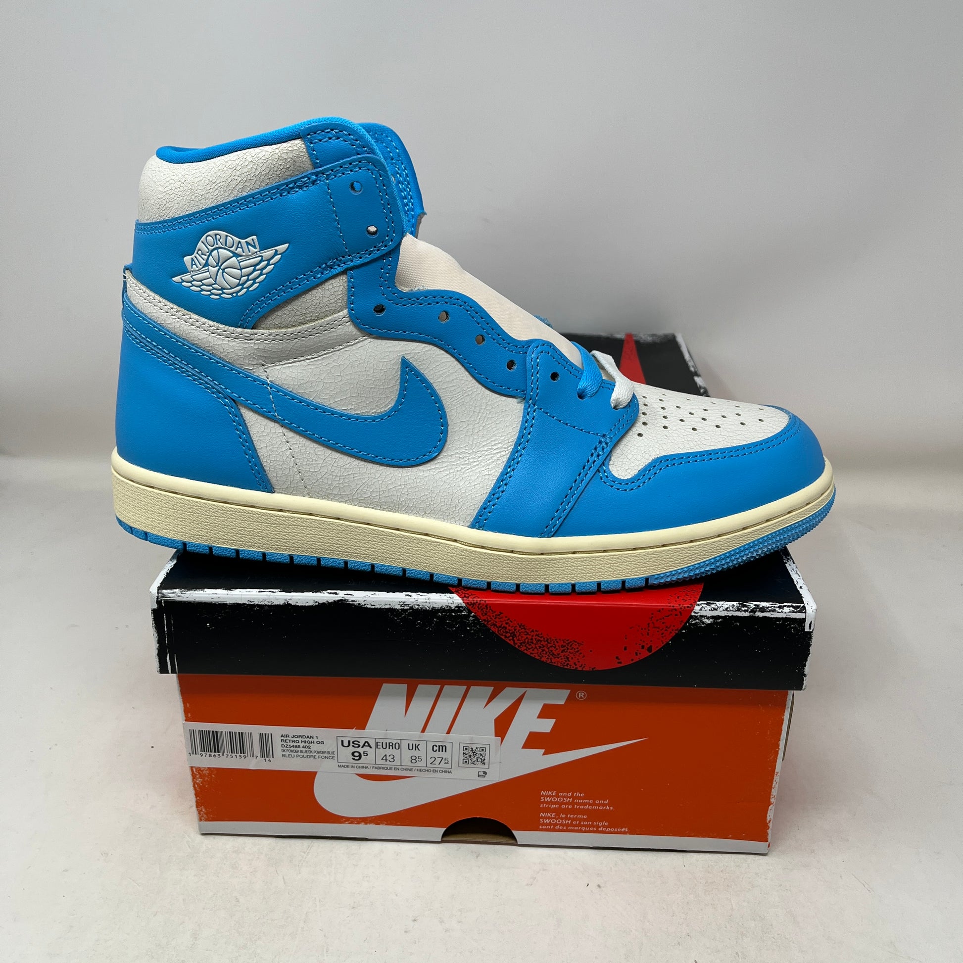 Authentic Jordan 1 Retro High OG "UNC Reimagined" in men's size 9.5. This pair is new and features the iconic University Blue and white colorway with a reimagined aesthetic, premium leather upper with pre-aged detailing, classic Nike Air branding, and vintage-inspired craftsmanship celebrating the legendary UNC heritage.