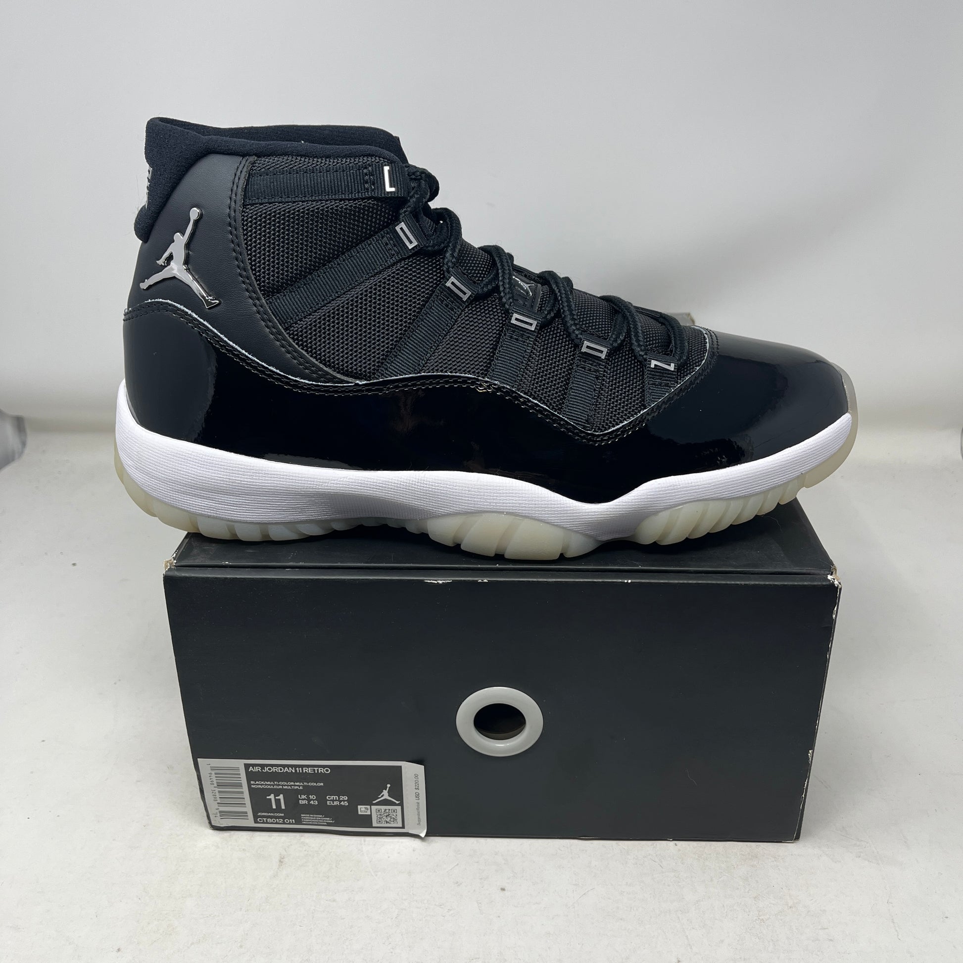 Authentic Jordan 11 Retro "Jubilee 25th Anniversary" in men's size 11. This pair is new and features the celebratory 25th anniversary colorway with white ballistic mesh upper, metallic silver patent leather overlays, classic Jumpman branding, translucent outsole, and full-length Air cushioning honoring the iconic Jordan 11 legacy.