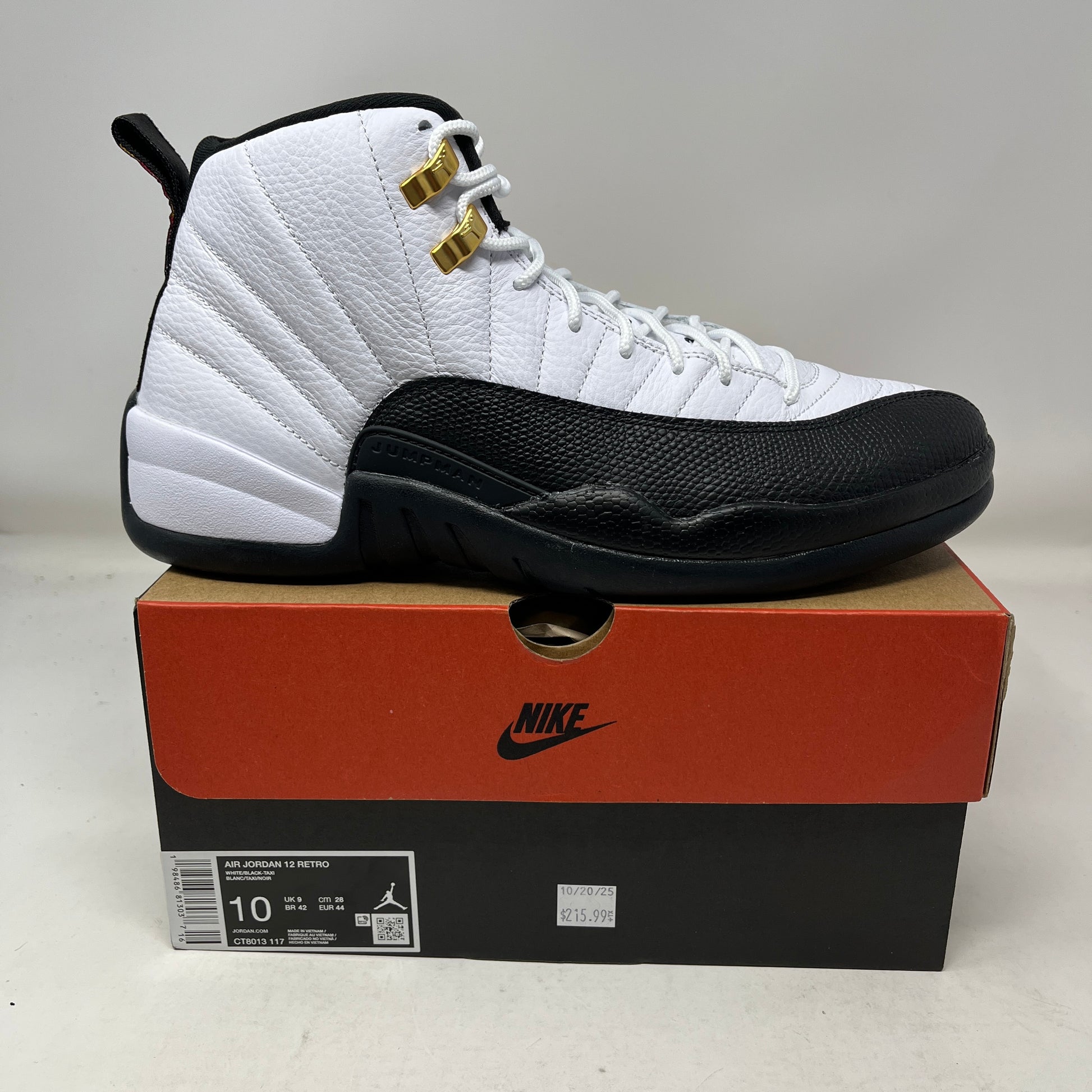 Authentic Jordan 12 Retro “Taxi” (2025) in men’s size 10, verified by Sneaker Soufflé Azusa.