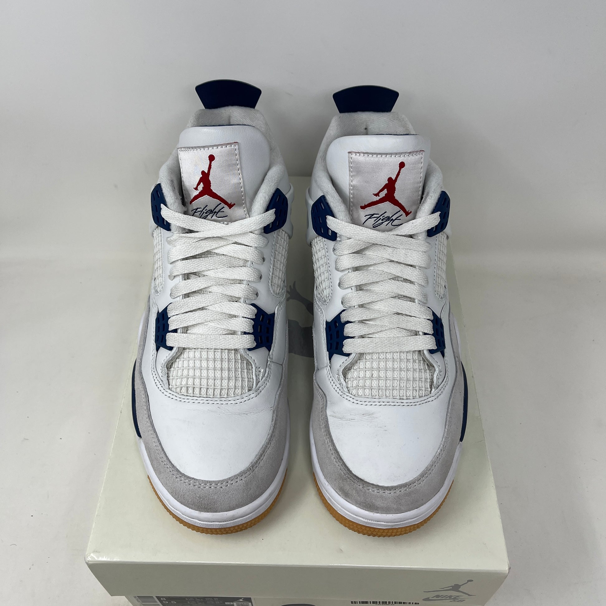Authentic Jordan 4 Retro SB "Navy" in men's size 8. This pair is used and features a premium navy suede upper with white and varsity red accents, classic mesh panels, visible Air cushioning, and iconic Flight branding—blending skateboarding culture with Jordan heritage.