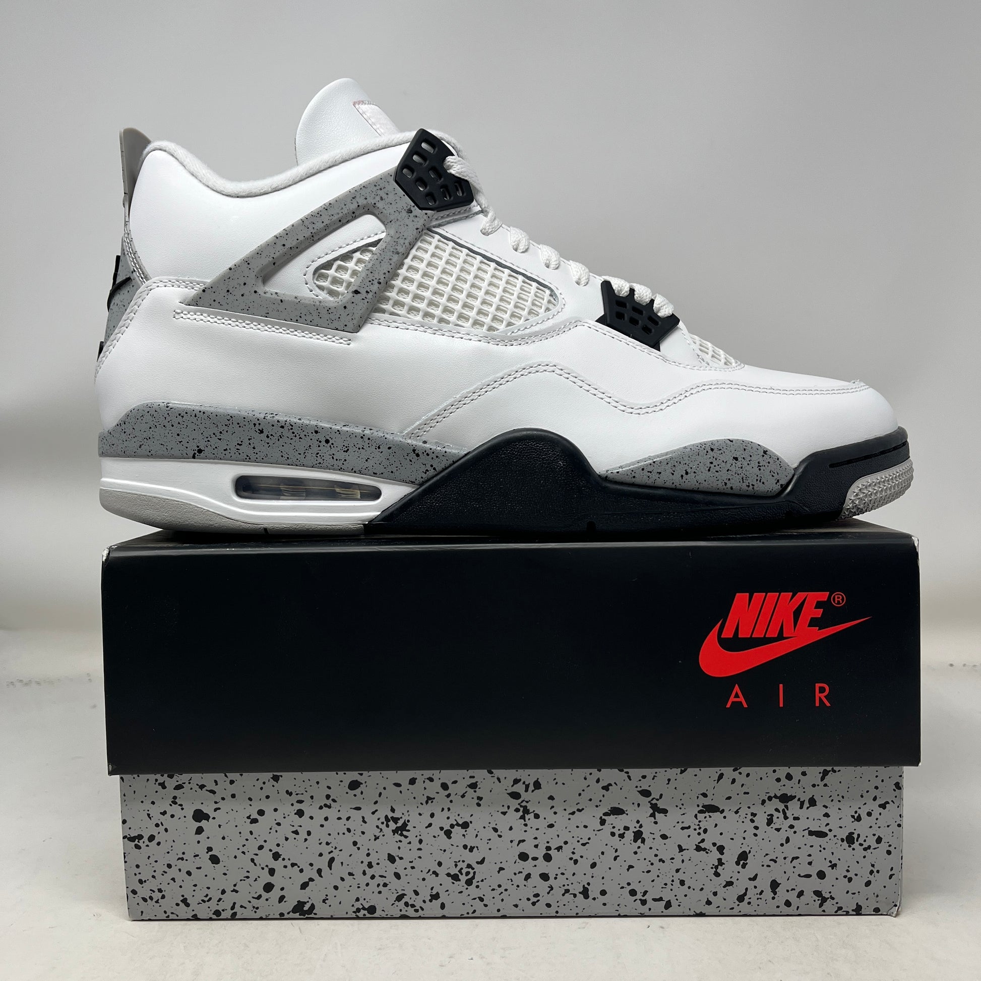 Authentic Air Jordan 4 Retro “White Cement” (2025) in men’s size 13. This pair is brand new and brings back one of the most iconic Jordan colorways of all time, featuring a white leather upper, speckled cement grey accents, black detailing, and classic AJ4 OG styling.
