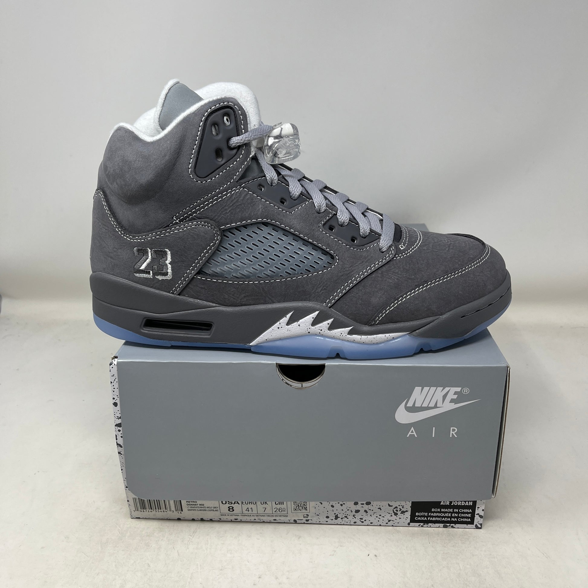 Authentic Jordan 5 Retro "Wolf Grey" (2026) in men's size 8. This pair is new and features a sleek wolf grey suede upper with black and white accents, reflective 3M tongue, visible Air cushioning, and signature fighter jet-inspired design details for a clean, versatile colorway.