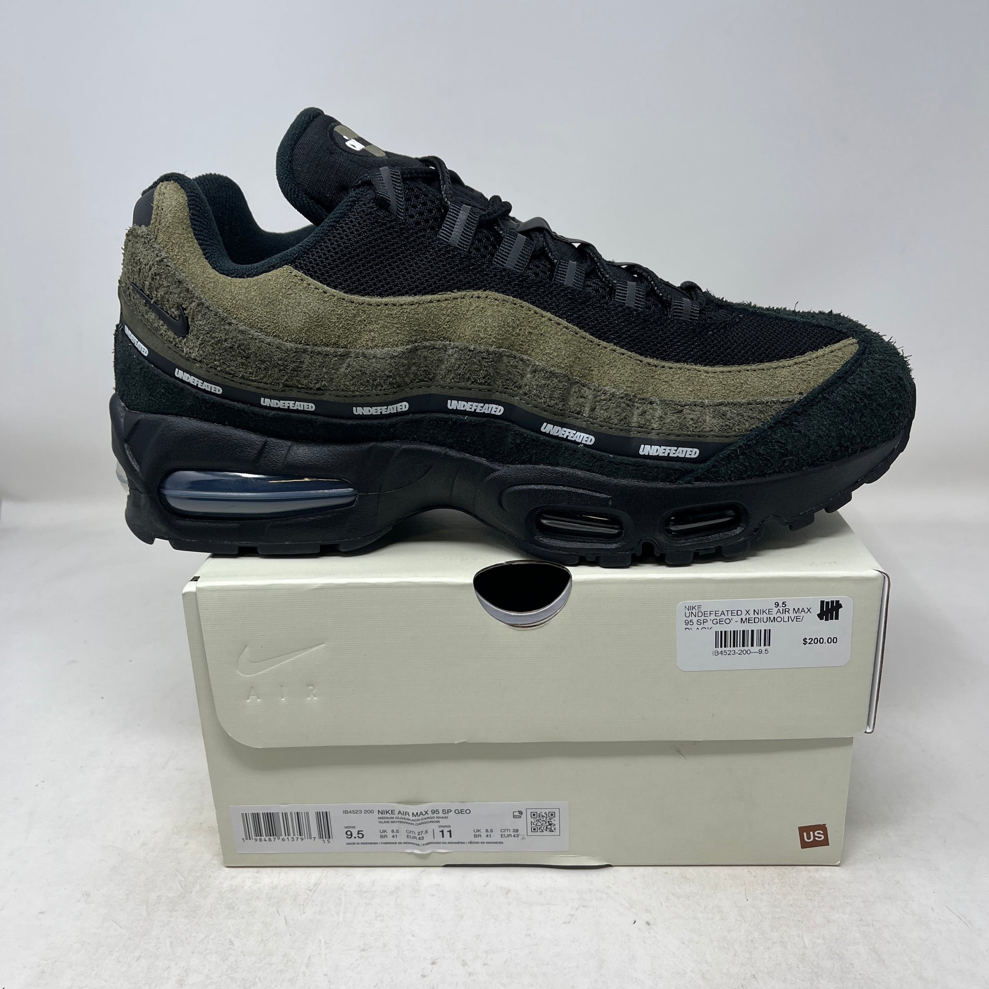 Authentic Nike Air Max 95 SP "Undefeated Geo La Brea Medium Olive" in men's size 9.5. This pair is new and features a premium medium olive and khaki upper with Undefeated's signature geometric camo pattern, co-branded detailing, visible Max Air cushioning, and classic Air Max 95 layered design for bold collaborative style.