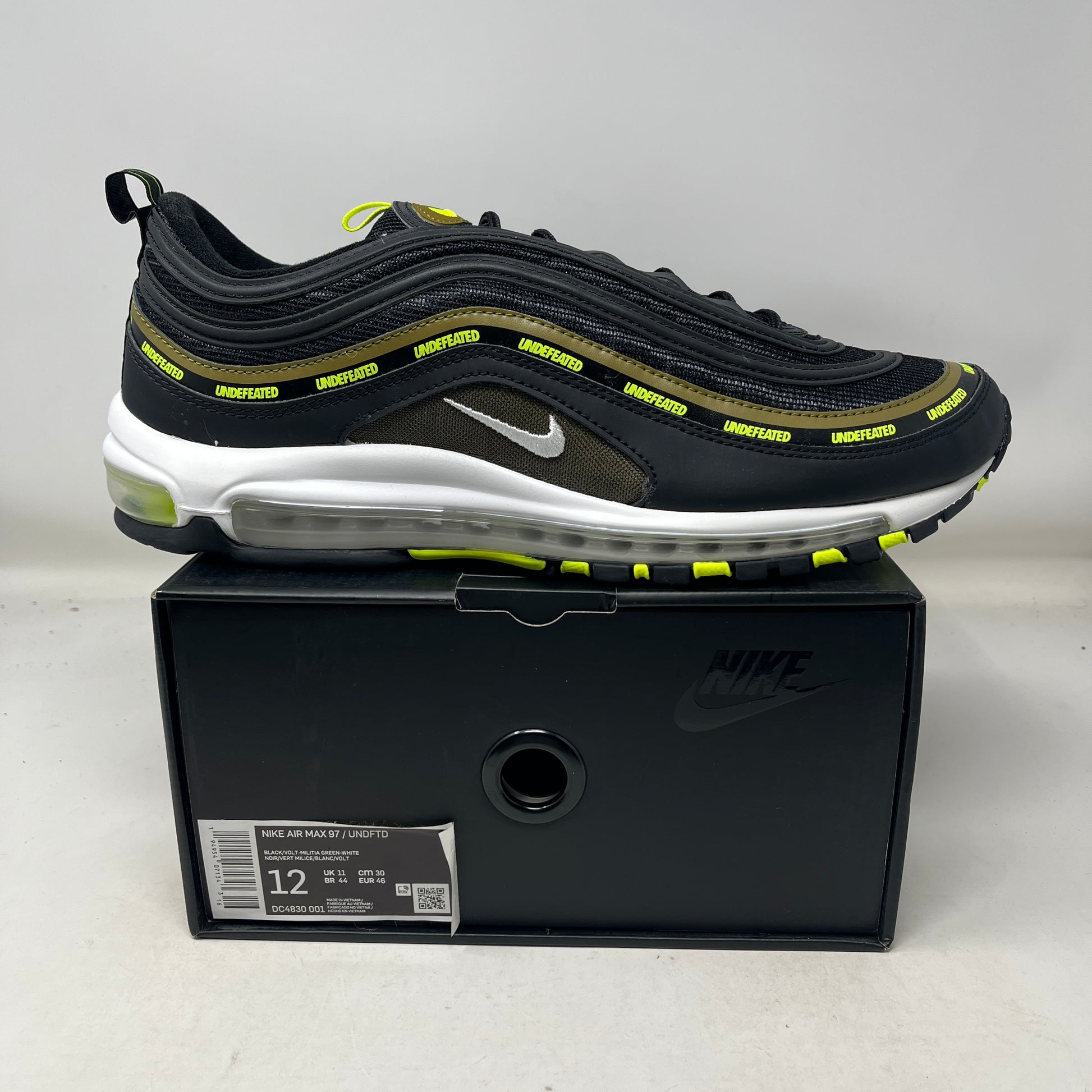 Authentic Nike Air Max 97 × Undefeated “Black Volt” in men’s size 12, verified by Sneaker Soufflé Azusa.