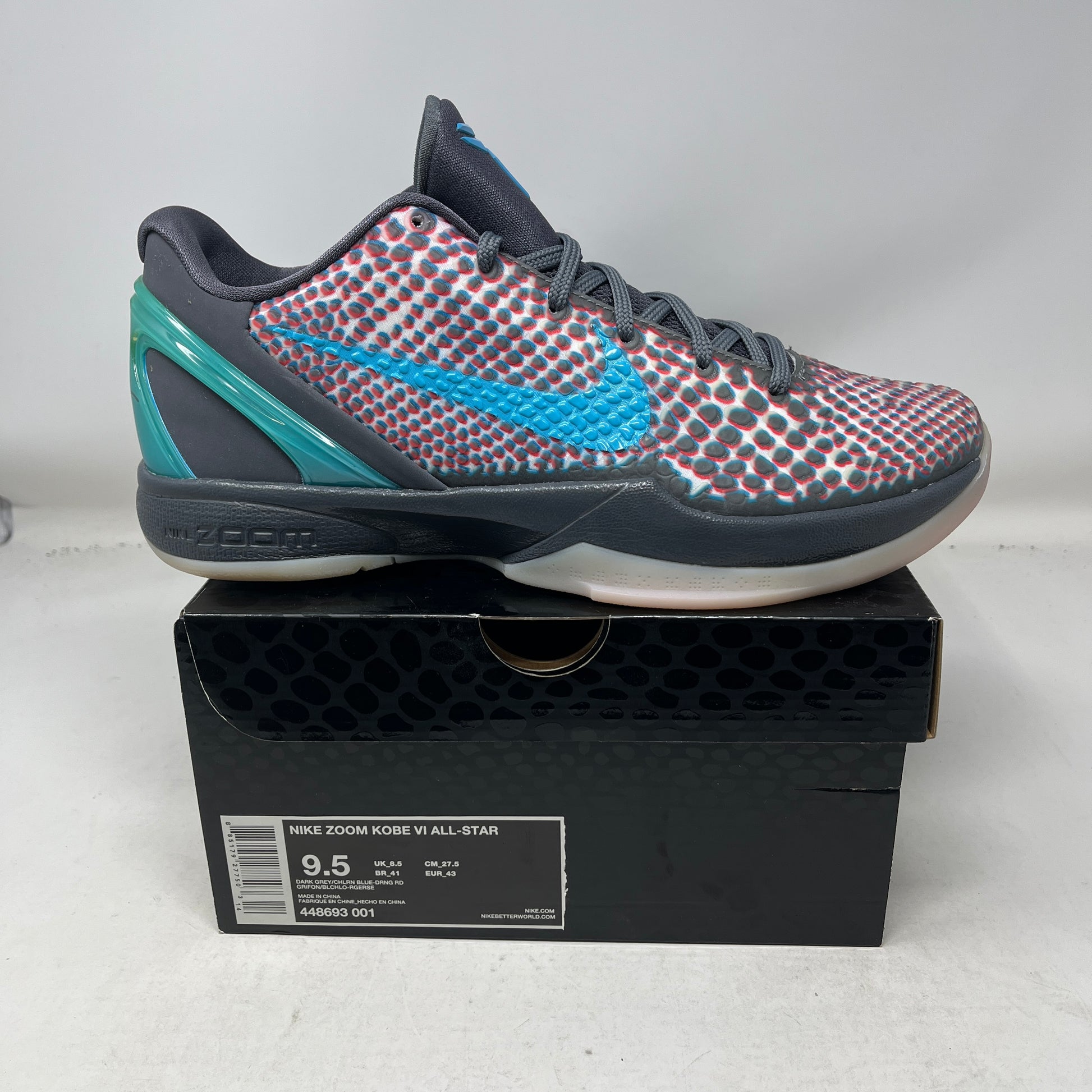 Authentic Nike Kobe 6 “All-Star / Hollywood 3D” in men’s size 9.5. This pair is brand new and features the standout 3D-inspired graphic upper tied to the NBA All-Star theme, built on the low-profile, performance-driven Kobe 6 silhouette.