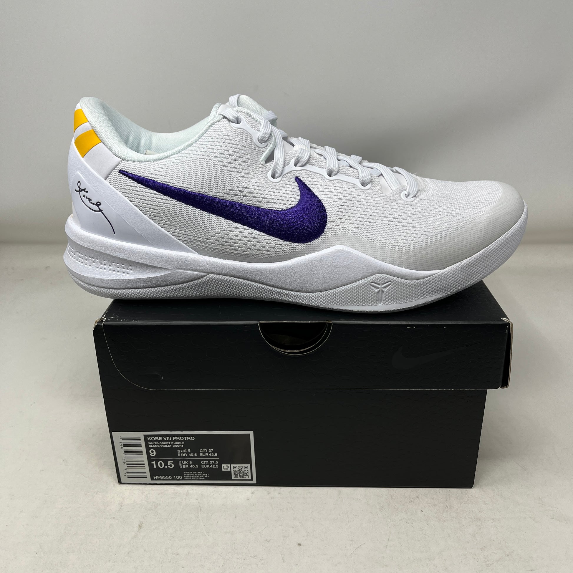 Authentic Nike Kobe 8 Protro "Lakers Home" in men's size 9. This pair is new and features the iconic Lakers home colorway with premium white and purple engineered mesh, gold accents, responsive Lunarlon cushioning, and low-profile Protro technology celebrating Kobe Bryant's championship legacy with the Purple and Gold.