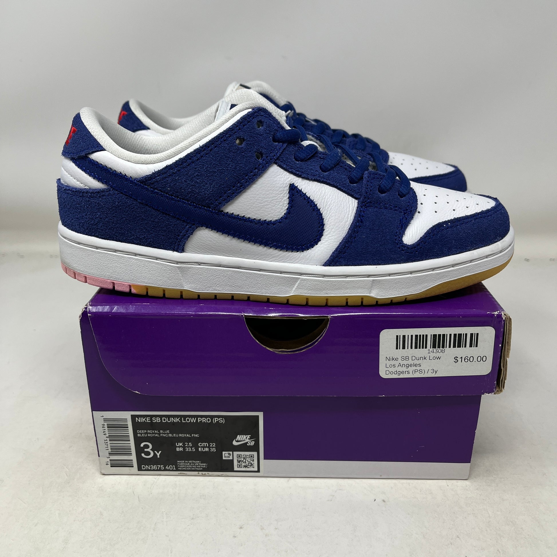 Authentic Nike SB Dunk Low “Los Angeles Dodgers” (Preschool) in youth size 3Y. This pair is used and features the iconic Dodgers-inspired colorway with blue and white tones, gum outsole detailing, and classic SB Dunk Low construction in a kid-friendly size.