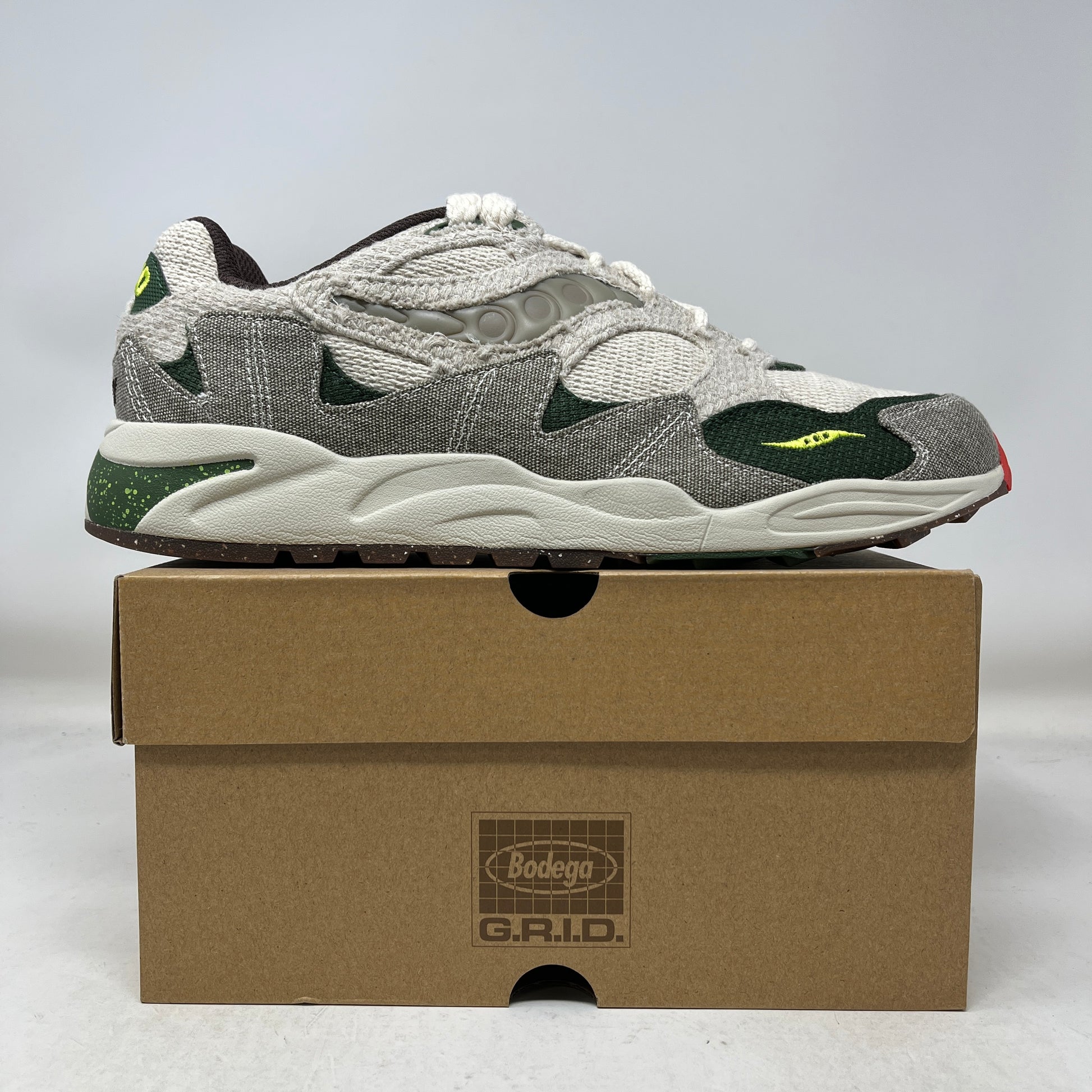 Authentic Saucony Grid Shadow 2 "Bodega Jaunt Woven" in men's size 11.5. This pair is new and features Bodega's premium collaboration with unique woven textile upper, Grid cushioning technology, premium materials, distinctive co-branded detailing, and Jaunt-inspired design celebrating Boston's iconic sneaker boutique and craftsmanship.