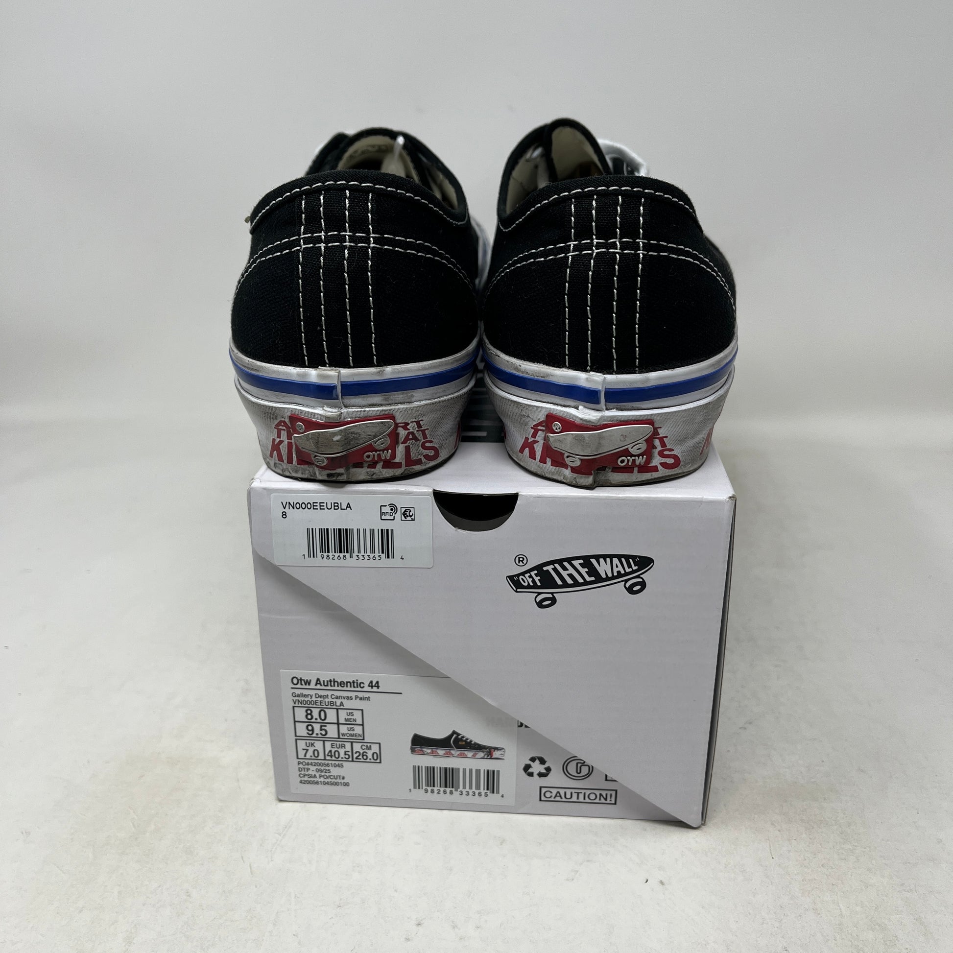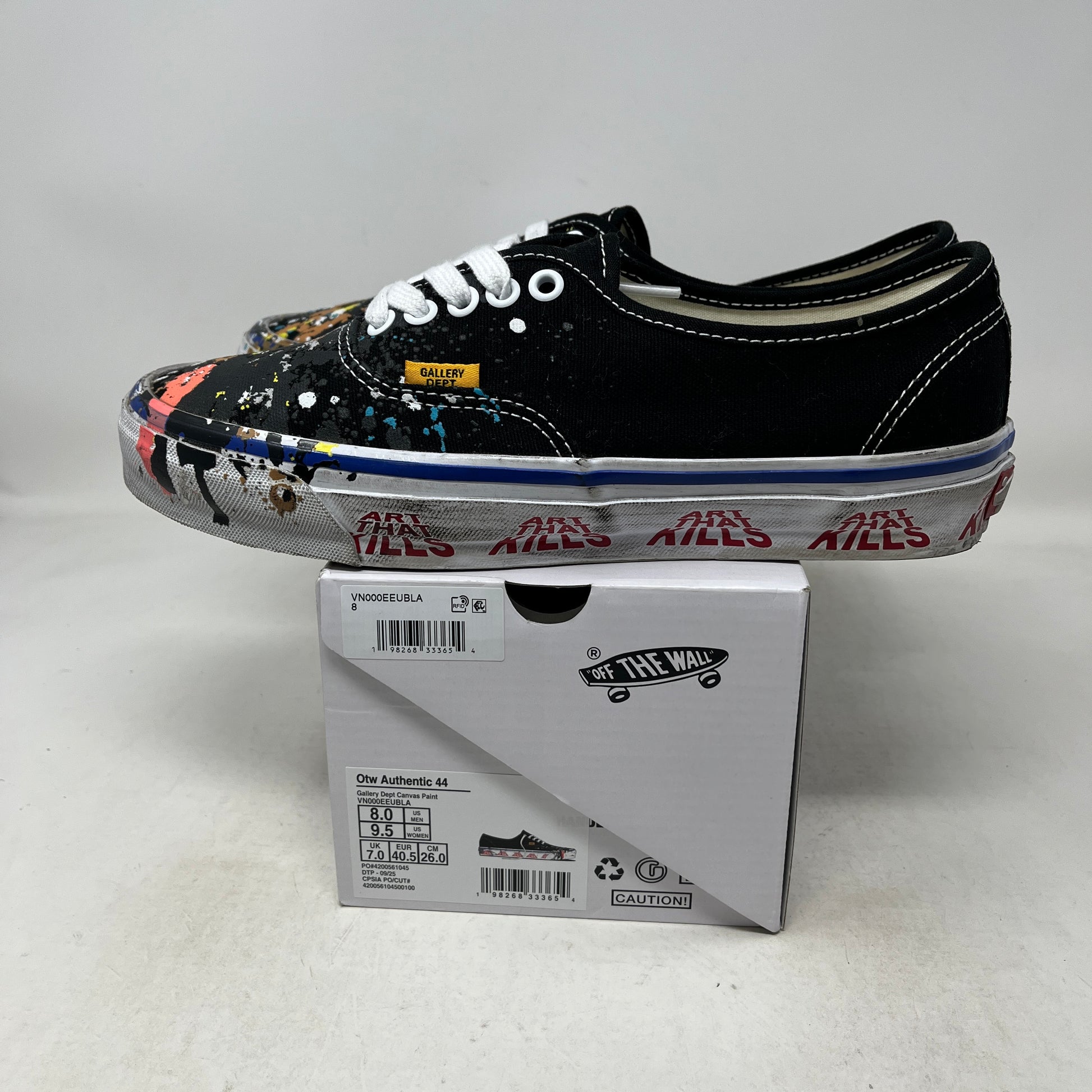 Authentic Vans Authentic Reissue 44 "Gallery Dept. Art That Kills Black" in men's size 8. This pair is used and features Gallery Dept.'s signature distressed aesthetic with unique paint splatters, a premium canvas upper, custom co-branded details, and the classic Vans waffle outsole for timeless skate-inspired style.